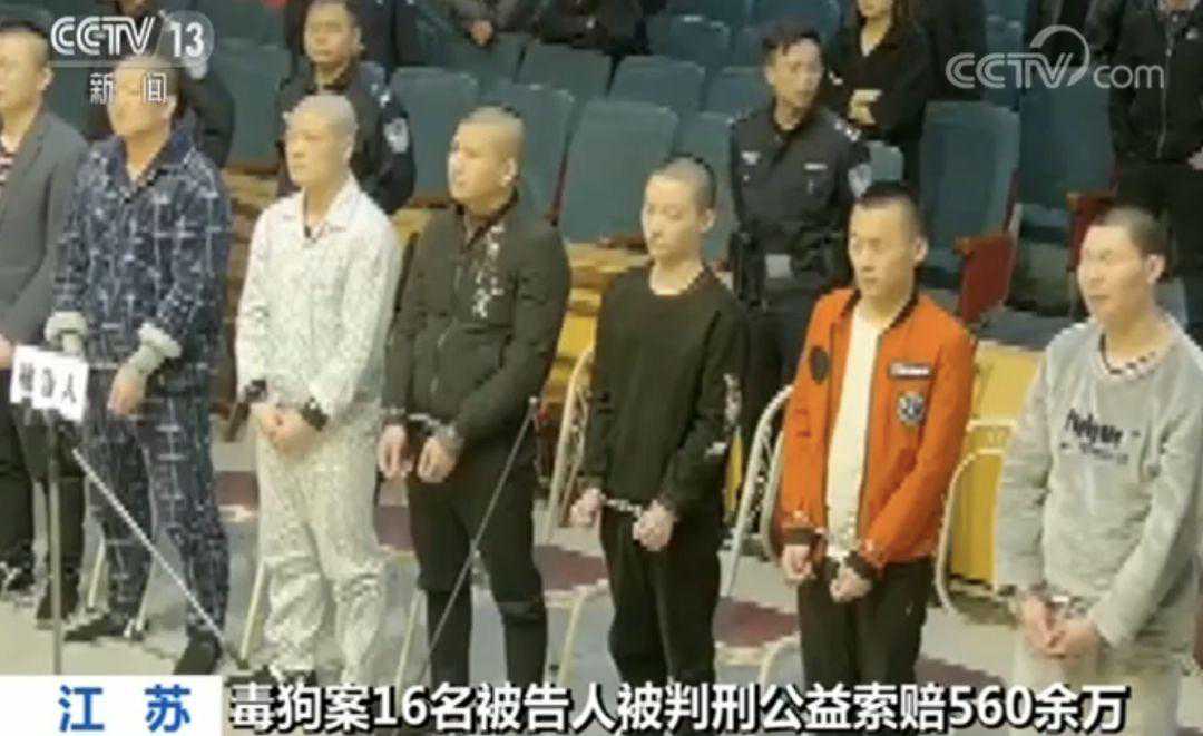 16名被告人被公益索赔560余万镇江丹阳市检察院依法对刘某等16人提起公诉,并提起刑事附带民事公益诉讼,诉请判处钱某、孙某娟和徐某喜、戴某夫妇、房某兰在各自侵权范围内支付毒狗肉销售金额10倍的赔偿金,共计5674168元,并在全国性媒体上公开赔礼道歉。