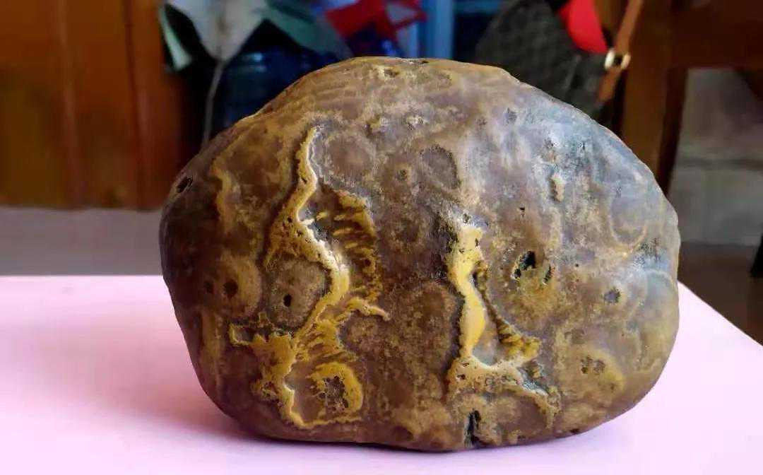他有一块黄蜡石,上面浮雕一般雕刻的龙与凤。