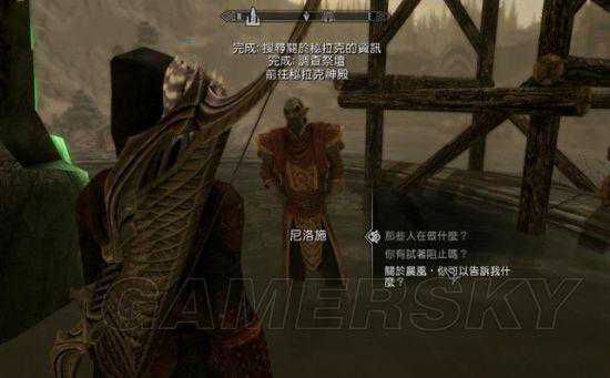 解决掉他们并搜身,找到纸条“教徒的命令”。纸条上写有此次攻击的命令,发布命令者是一个叫秘拉克的人,称主角为假龙裔。他们所乘的船只是北方处女号,停泊在风舵城的码头。