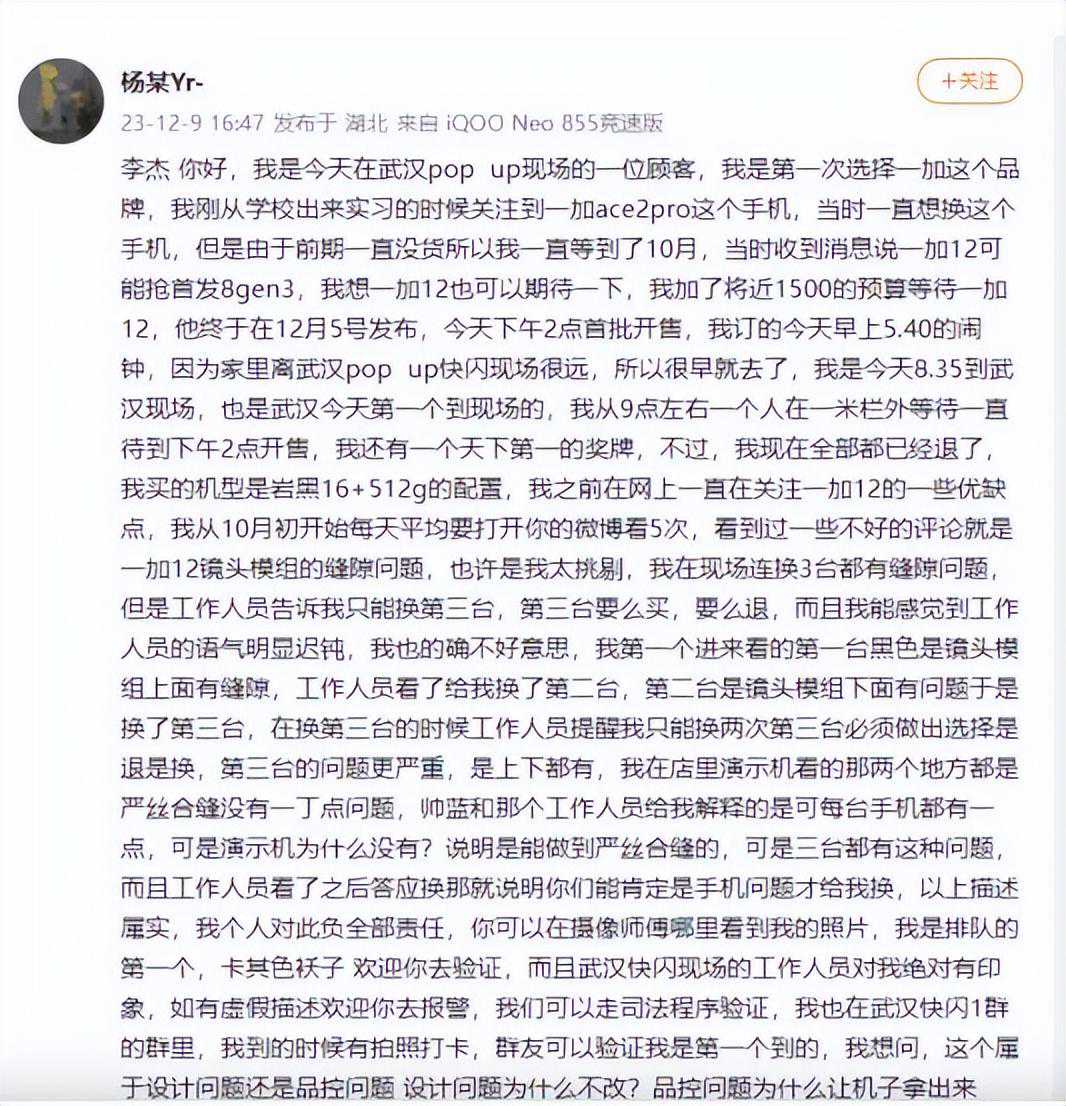 被这位负责人称为“大委屈”的一加12,在2023年12月9日线下大型快闪活动中,用户连续换了3台都出现质量问题,第一台镜头模组上面有缝隙,第二台是镜头模组下面有问题,第三台问题更严重,是镜头模组上下都有问题。