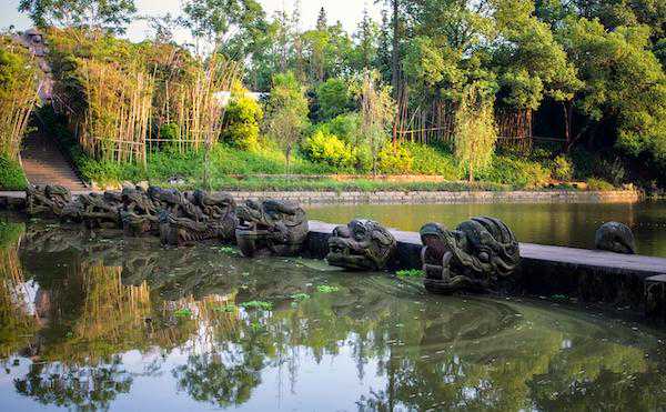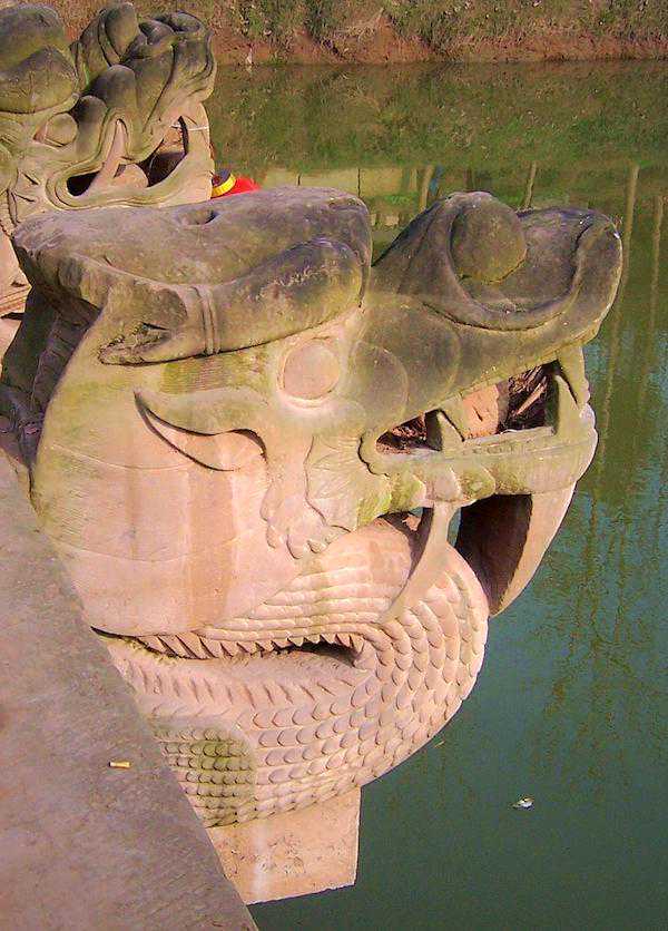 原来,如果遇到涨水,河水刚好淹没桥面,河面上便只见这8只神兽的头尾。它们像活生生的庞然大物,在激流中斩浪博击,龙口和麒麟口中的石珠在流水冲击下滚动,并且发出咕噜噜的响声。那场面,真是惊心动魄、气势磅礴啊!
