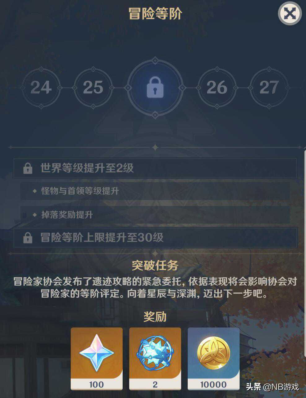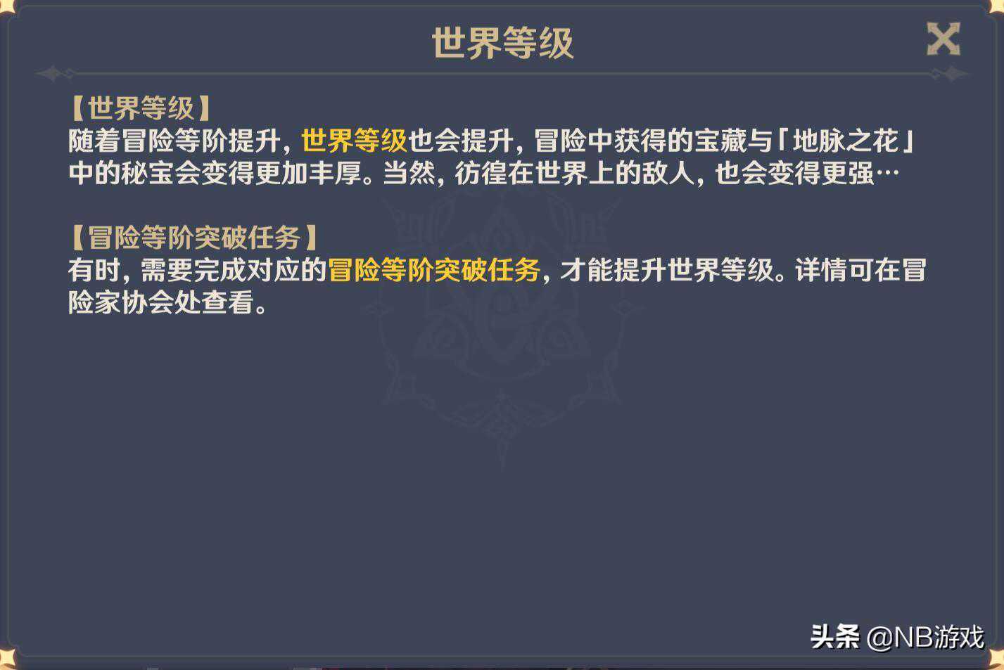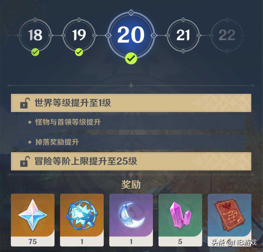 那么如何进行卡级呢?NB游戏君觉得世界等级1级就可以卡一下,只要不领取20级冒险等阶奖励即可,但是考虑到角色的等级突破太低,没法最大化英雄的实际体验,可以适当卡在25级冒险等阶,这个时候提升世界等级2级的时候,需要一个突破任务,只要不打这个任务,就可以一直卡住世界怪物的等级,而我们的角色则是可以卡在最大化的战力上,野外的怪物刀刀秒。哪怕风魔龙和北风狼也可以用某些英雄进行快速斩杀,这种感觉是不是倍爽?