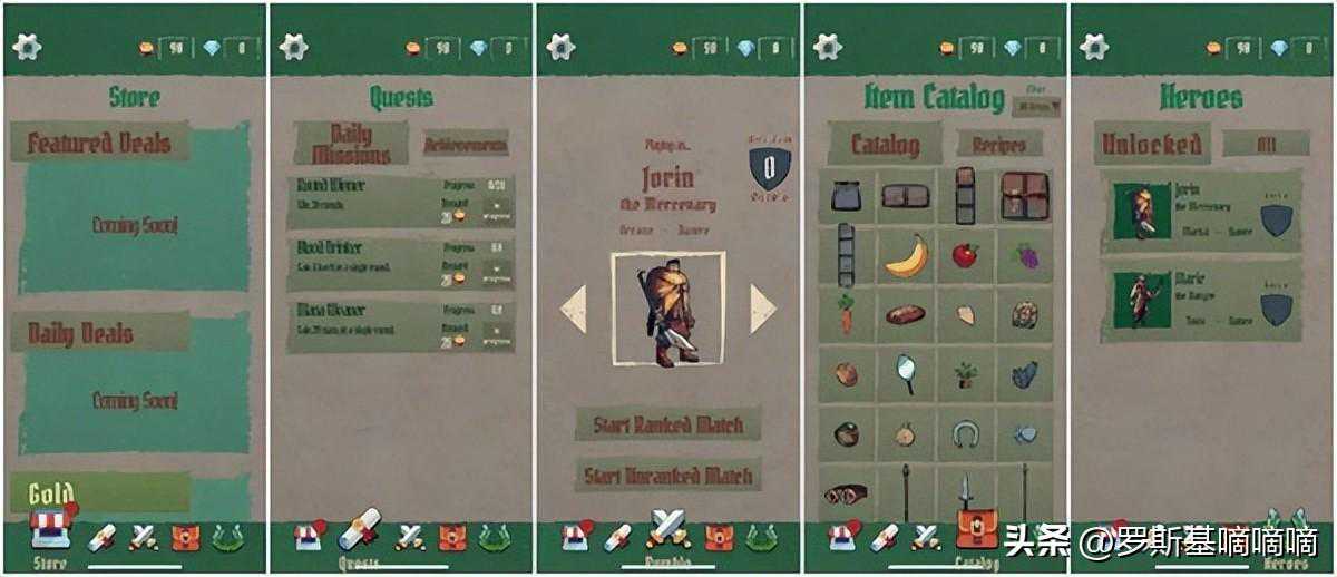 下图是游戏的5个主页面,分别是商城、任务、战斗、物品目录和英雄。游戏提供了Ranked和Unranked两种模式,当玩家选择好英雄之后即可开始。