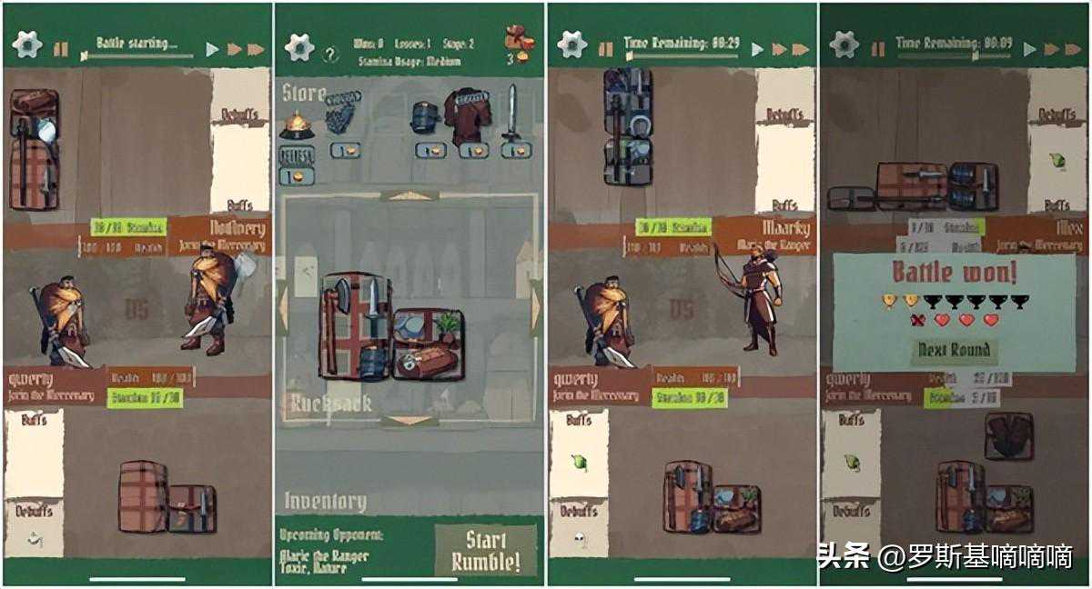 战斗中,人物将自动使用背包中的物品,例如武器可以造成伤害、衣服提供减伤或增伤,食物可以恢复生命。每场战斗结束后可获得金币,还可以获得装备奖励。金币可购买新的装备和物品,将所有装备整理好后,便可以开始下一次战斗。