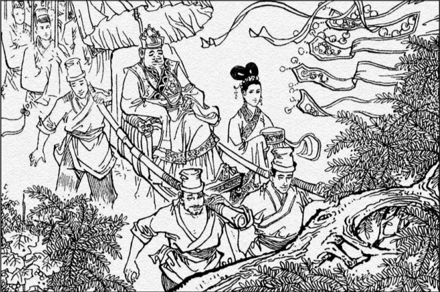马骥正看得出神,只见大门大开,一队仪仗引导一顶黄罗伞盖簇拥而出。村人小声说:“现在正退朝,看看朝廷的官员吧!”说罢,两人急忙躲入树后。
