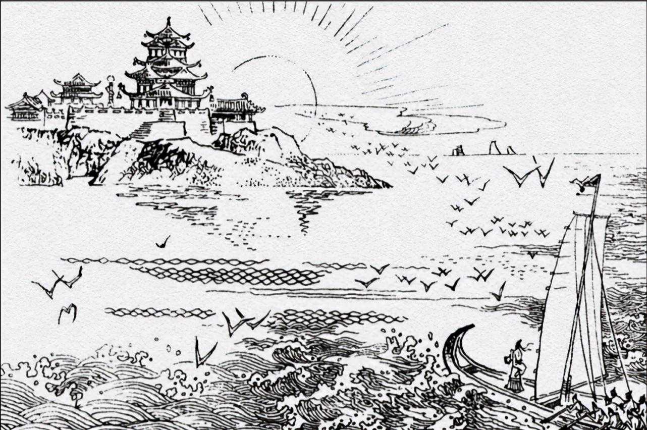 第二天一早,村人带领马骥乘上帆船,直向大海中驶去。帆船航行了一宿,第二天黎明,在洒满朝霞的海面上,隐隐约约出现了楼台亭阁。村人告诉马骥说:“前面就是海市。”