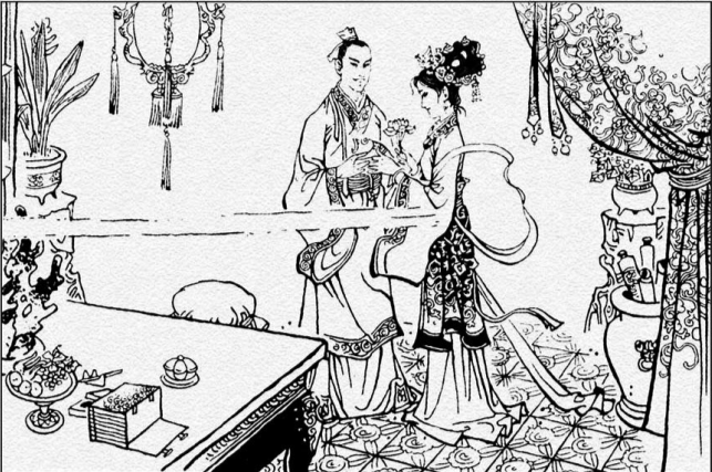 马骥来到洞房,室内陈设幽雅别致,只见珊瑚床上铺着鹅绒被,香帐四角挂着夜明珠,桌上摆着奇珍异宝,皆平生所未见。正看得出神,新娘面带羞容来到面前。只见她生得柳眉杏眼、婀娜多姿。马骥见了,心里十分高兴。